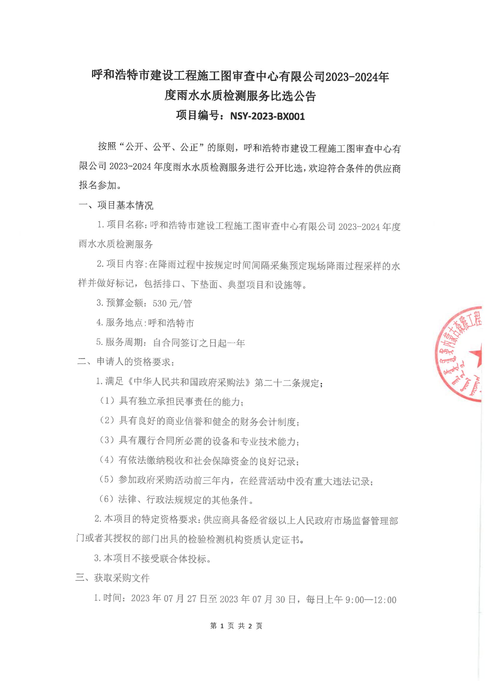 呼和浩特市建設(shè)工程施工圖審查中心有限公司2023-2024年度雨水水質(zhì)檢測(cè)服務(wù)比選公告